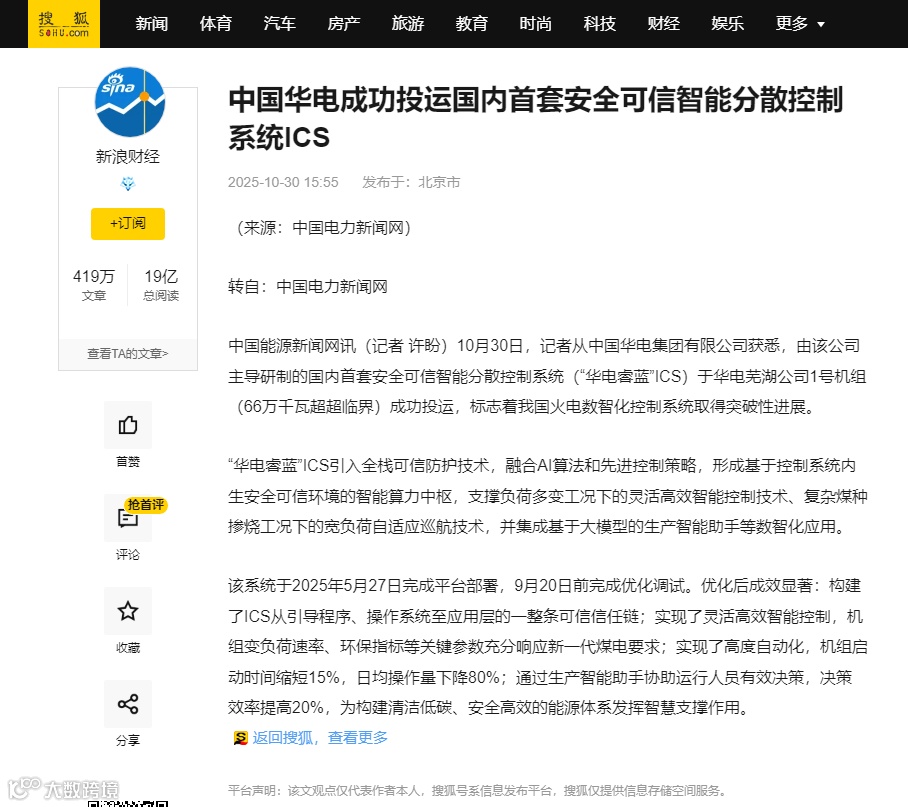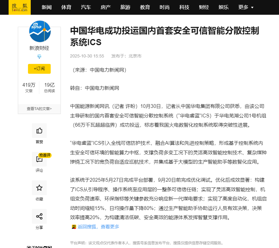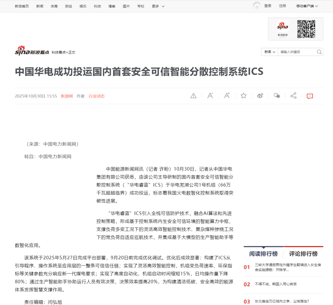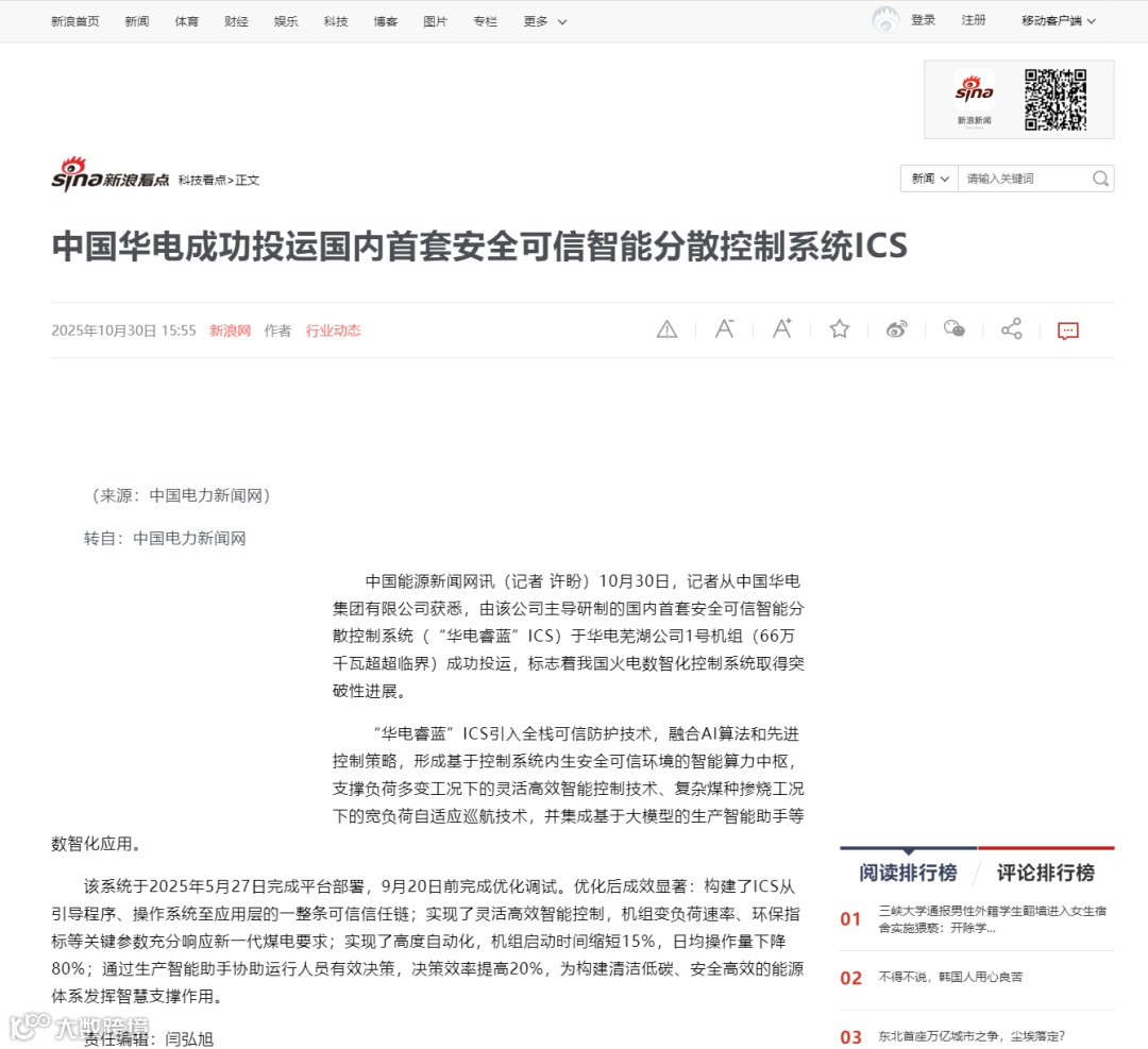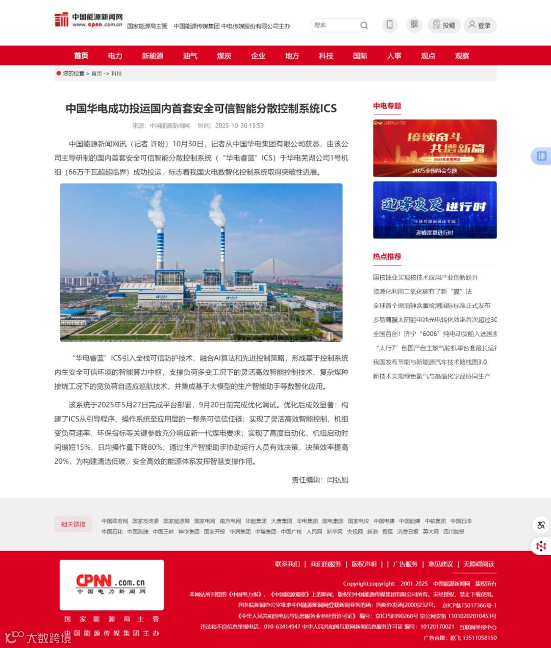 近日,《中国电力报》等多家媒体对中国华电安徽成功投运国内首套安全可信智能分散控制系统ICS进行了报道和转发。以下是报道内容:
