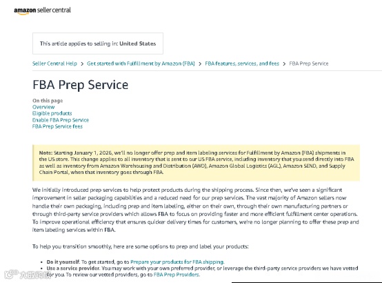 亚马逊美国站FBA服务将迎来重大调整!平台近日发布公告称,自2026年1月1日起,将全面取消商品入库前的预处理和贴标服务。