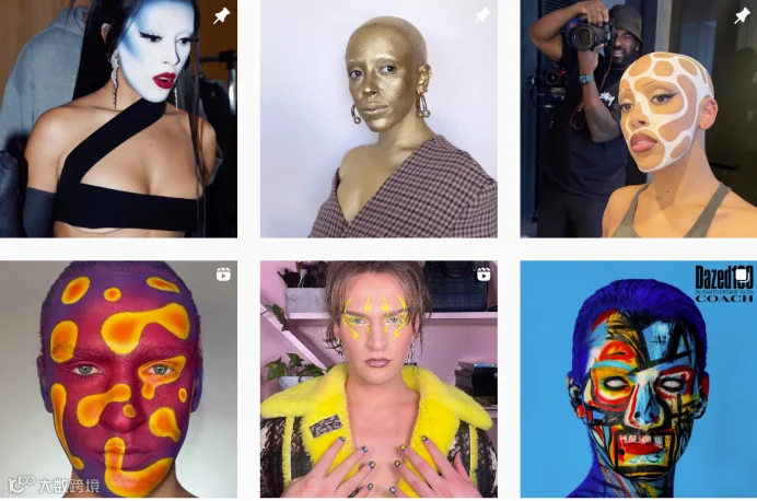 Z世代对于美妆方面开始逐渐重视追求自我个性,不在意他人看法,通过妆容造型表达个人独特色彩。例如,Instagram上一位“@laurelcharleston”的化妆师,主页上皆是作品分享,各种独特的妆容,瞬间吸引大家眼球(上图),上图,前三篇个帖子皆获得上万个点赞,其中,第三篇帖子甚至获得55万点赞,1806条评论。