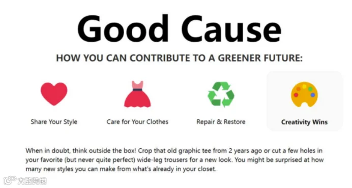 Cider衣服的包装上采用d₂w 可生物降解袋,并附上包装袋循环利用的多种用法;Cider部分系列服装由全球回收标准 (GRS) 认证的回收材料制成,号召回收材料生产最大限度减少碳释放。除此之外,Cider在独立站倡导消费者环保,附加环保做法,衣服可循环使用。