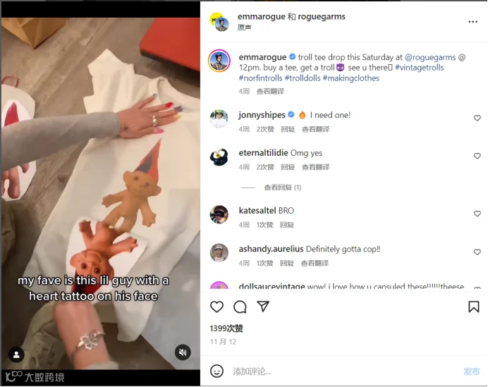 Instagram上“@emmarogue”的博主,一位年轻时尚的女孩,她主页上的帖子都是关于服装设计和DIY相关内容,上图内容为她将认为好看的图案印在T恤上,该视频拥有1399点赞,评论区表达的都是喜欢、想拥有等类似言语,可见当下Instagram用户对于DIY服装喜爱和热情。