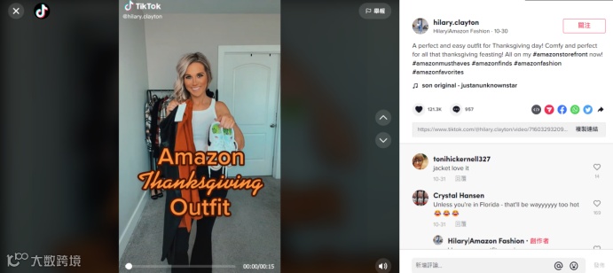 如上图中,女主播拎着鞋子和衣服,封面写着“Amazon Thanksgiving Day Outfit”清晰传达视频的主题,精准吸引感兴趣用户观看。