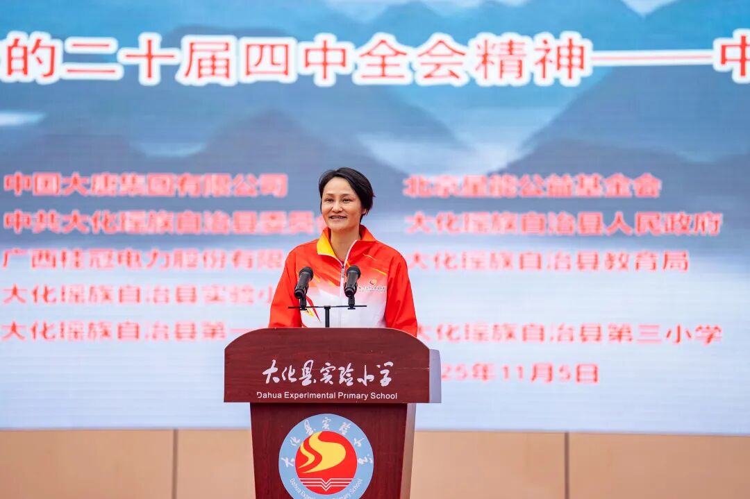 当日上午,大化瑶族自治县实验小学操场上,五星红旗在和煦的阳光下迎风舒展,200余名身着校服的学生整齐列队,眼神中满是期待与憧憬。“体育不仅能强健体魄,更能磨炼意志、塑造健全人格,它彻底改变了我的人生轨迹。” 北京星能公益基金会创始人、跳水奥运冠军高敏结合自身经历,向同学们分享了体育路上的拼搏故事,既传授科学的运动技巧,更传递永不言弃、追求卓越的体育精神,让在场学子备受鼓舞。