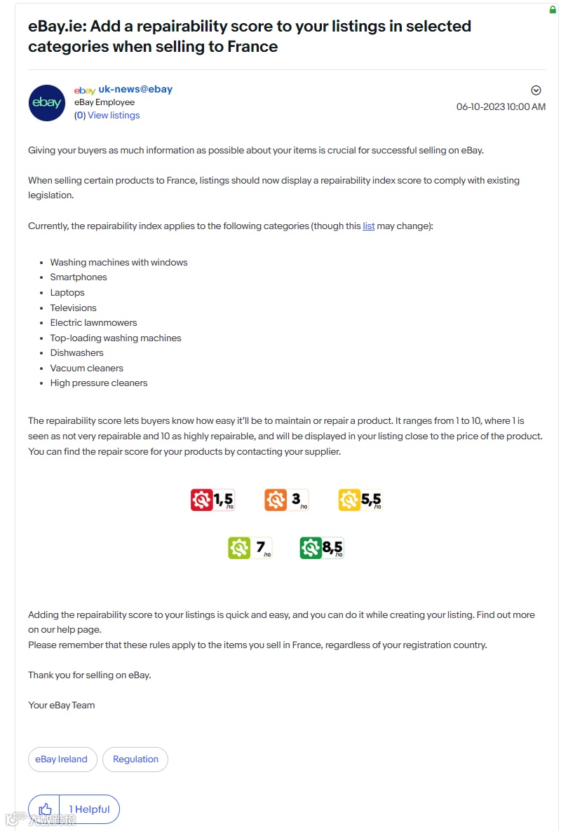 近日eBay英国、德国和意大利等多个站点发布公告提醒卖家遵守法国EPR(生产者责任延伸)法规。在法国销售某些电子设备的卖家,必须提供“可维修性指数”( repairability index)。