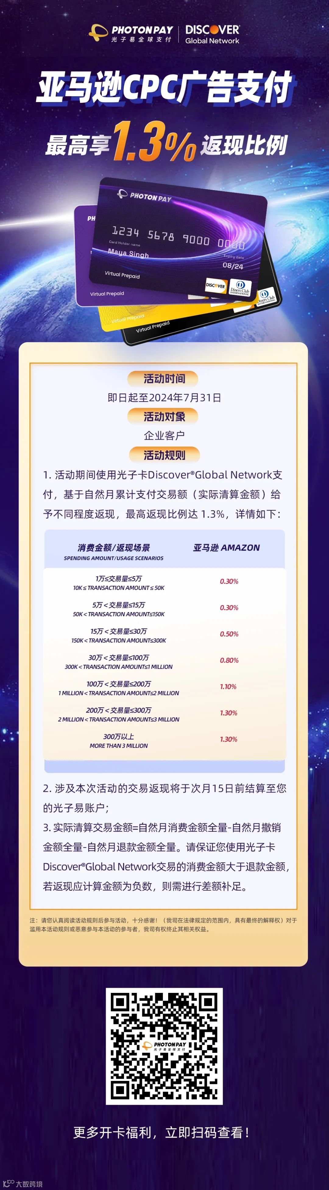 为回馈广大客户的厚爱,近期光子卡Discover® Global Network推出亚马逊CPC广告费限时返现活动,最高返现1.3%,助力卖家畅付亚马逊站内广告费,并有5重福利为更多卖家带来实实在在的利润提升!