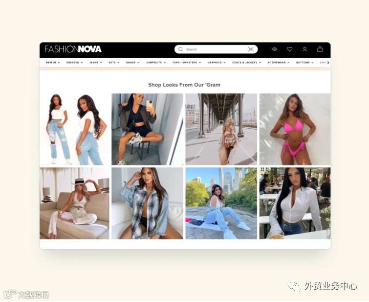 Fashion Nova 通过 Instagram 搭建购物场景,鼓励消费者分享穿搭照片,并将其整合进品牌官方账号和商城页面,形成可购物的社交内容生态[k]。