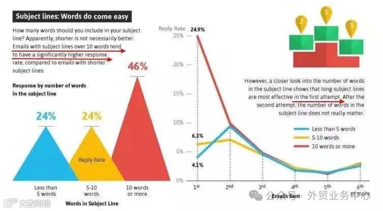 研究发现,包含10个左右单词的主题行在首封邮件中回复率高达46%,而少于10个词的平均回复率仅为24%。对于第二、第三封邮件,主题行长短影响不大[k]。