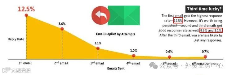 首次邮件的平均回复率为12.5%。若未获回应,第二封邮件回复率约为8.6%,第三封为3.1%。三次发送累计回复概率可达25%。第四次及以后的发送效果几乎为零,因此不建议超过三次跟进[k]。