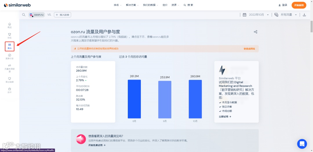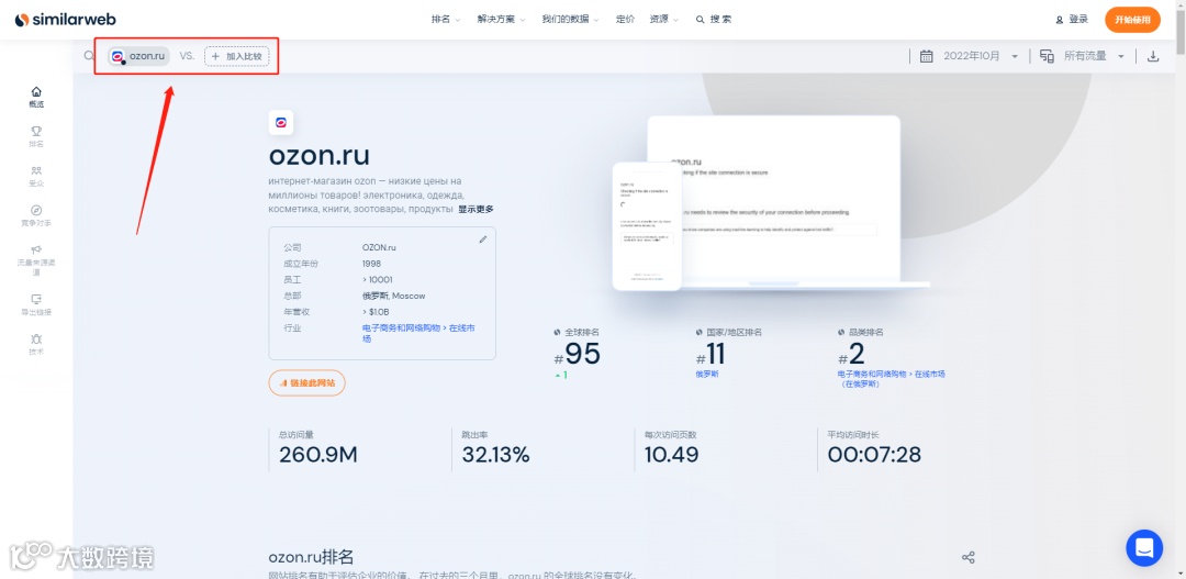 打开网站后无需登录,直接输入目标网站名称即可查询。以俄罗斯OZON平台为例: