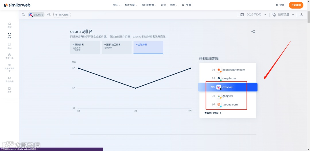 OZON品类排名为第2位,总访问量达260.9M。其国家/地区排名和全球排名分别为第11位和第95位,甚至高于淘宝。
