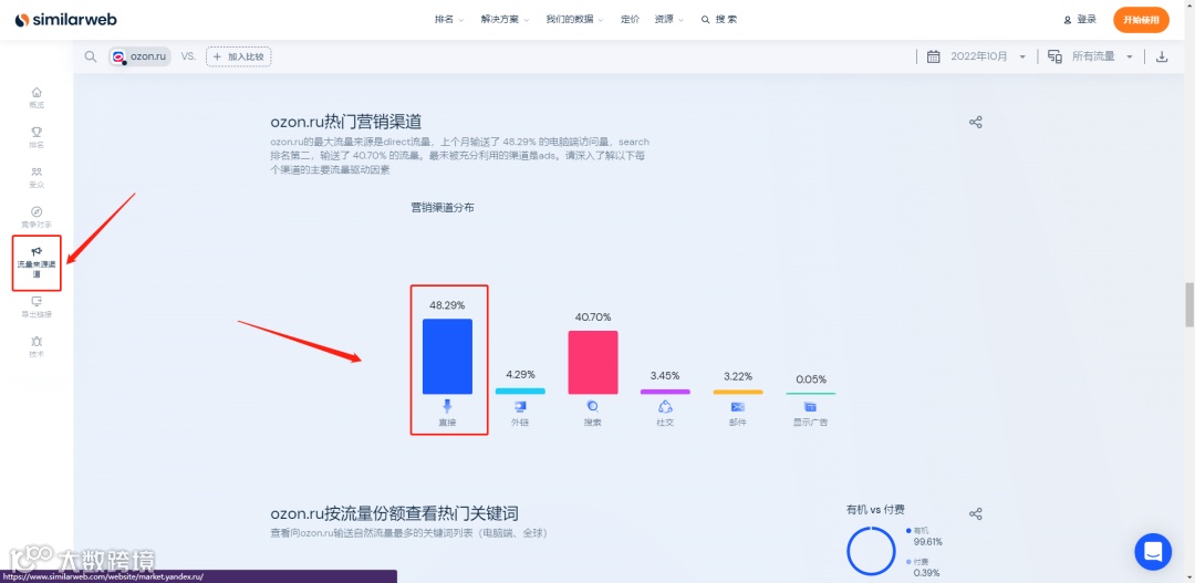 此外,SimilarWeb还提供竞争对手分析功能。OZON的主要竞争对手包括eldorado、mvideo、wildberries等。流量来源显示,OZON主要依赖直接流量(48.29%)和搜索流量(40.70%),广告渠道尚待开发。