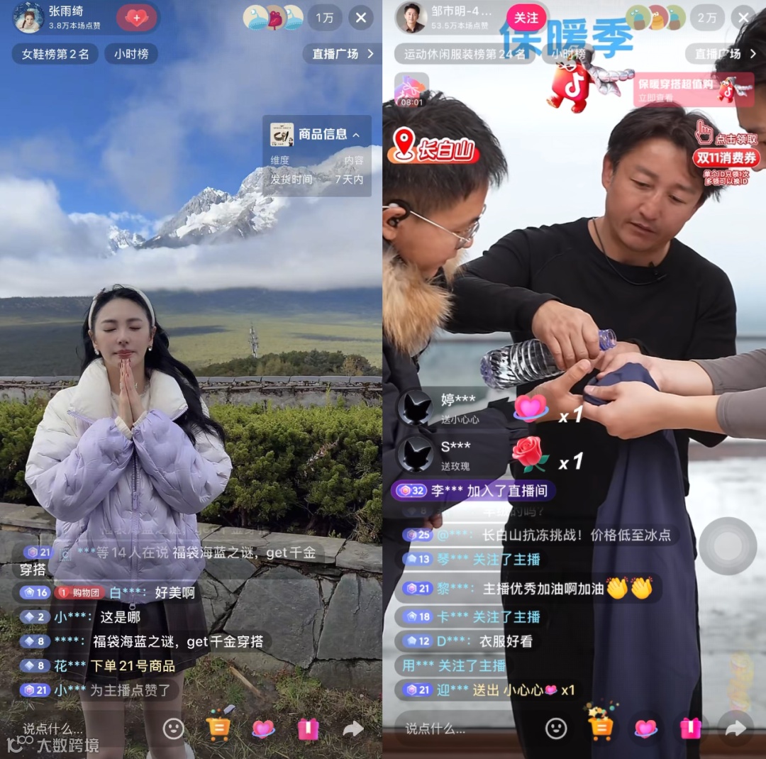 在本次抖音电商双11保暖季,直播间从恒温室内移到了风雪极寒的户外现场,真实的环境测试取代了枯燥的参数对比,成为产品力最直接的表达。