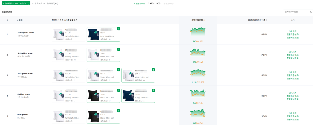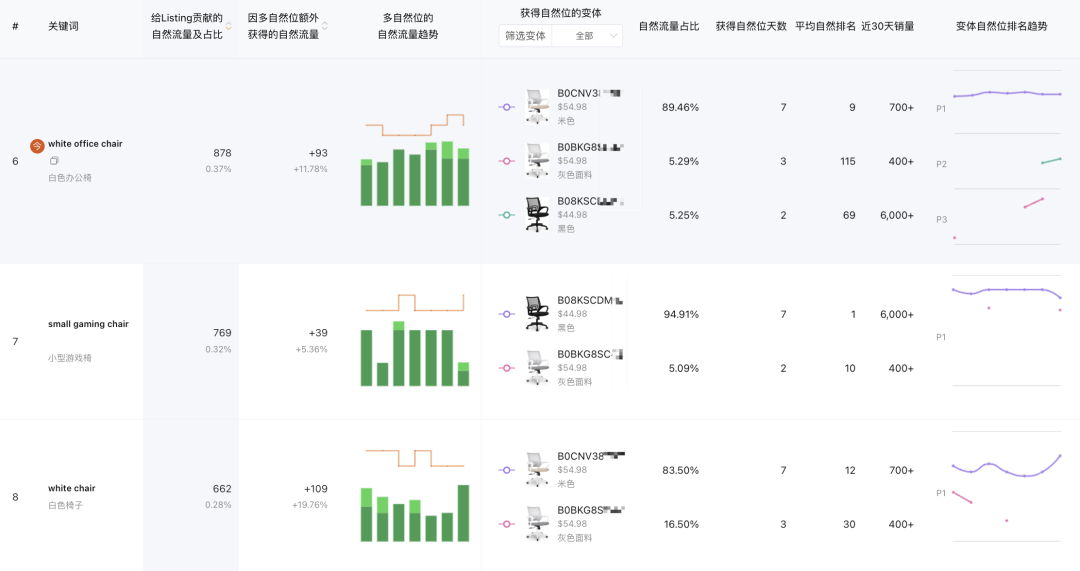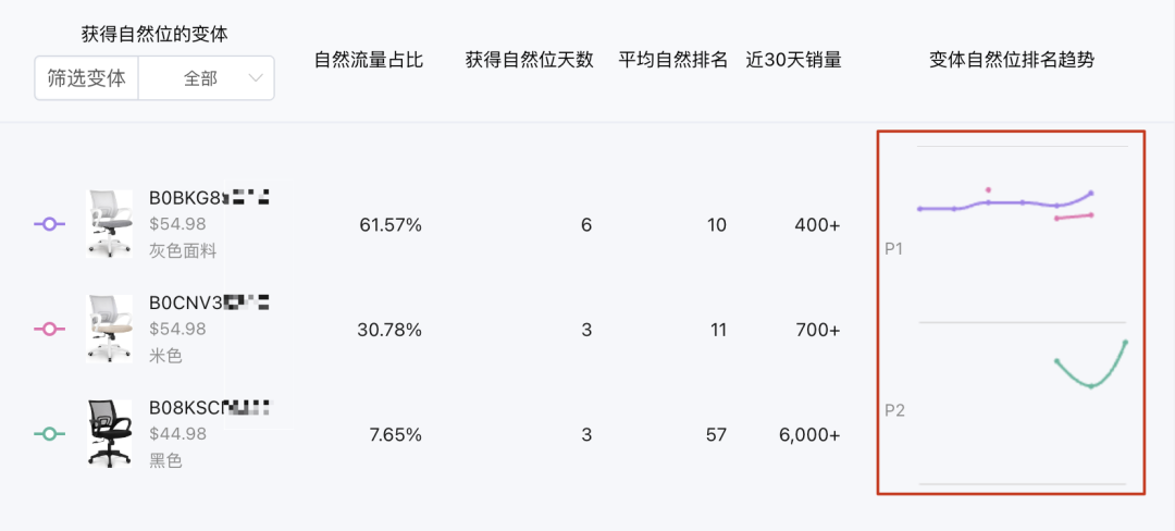 变体相关:包含获得自然位的变体、获得自然位的天数、平均自然排名、自然流量占比,变体近30天的销量,以及变体自然位排名趋势;