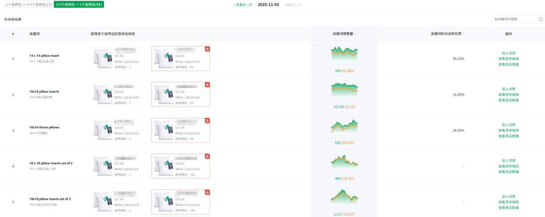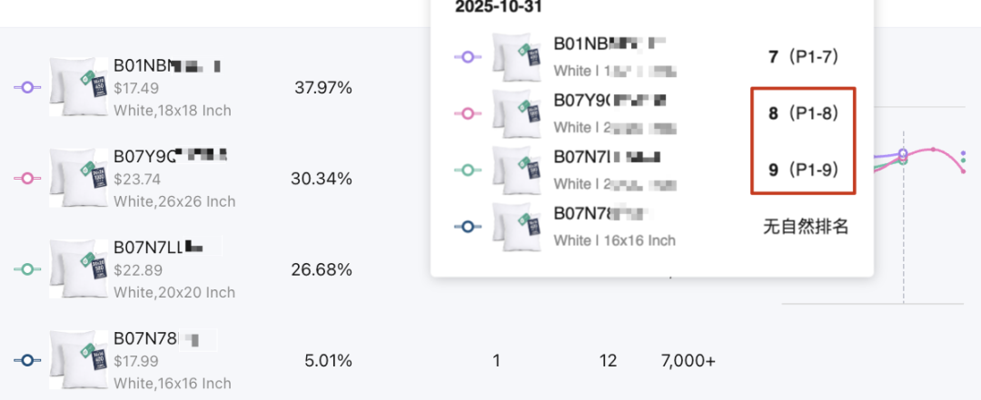 这是一个链接的多个变体在同一个关键词下同一天的三个自然位,其中排名第7的产品是原来就有的自然位,8和9都是新增的。而这两个新增的自然位额外带来的自然流量,一定比排名第7的产品还多(1+1>2)。