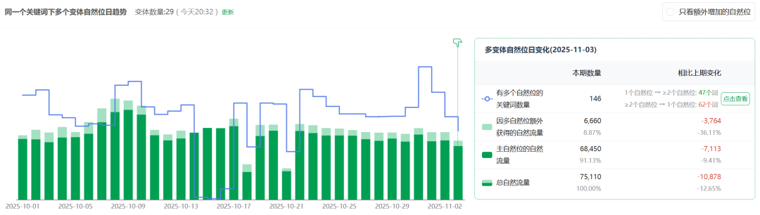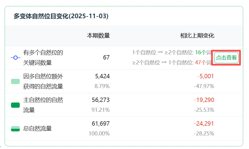关键词相关:包含多自然位后自然流量市场份额变化、关键词搜索量变化,以及关键词点击转化率。