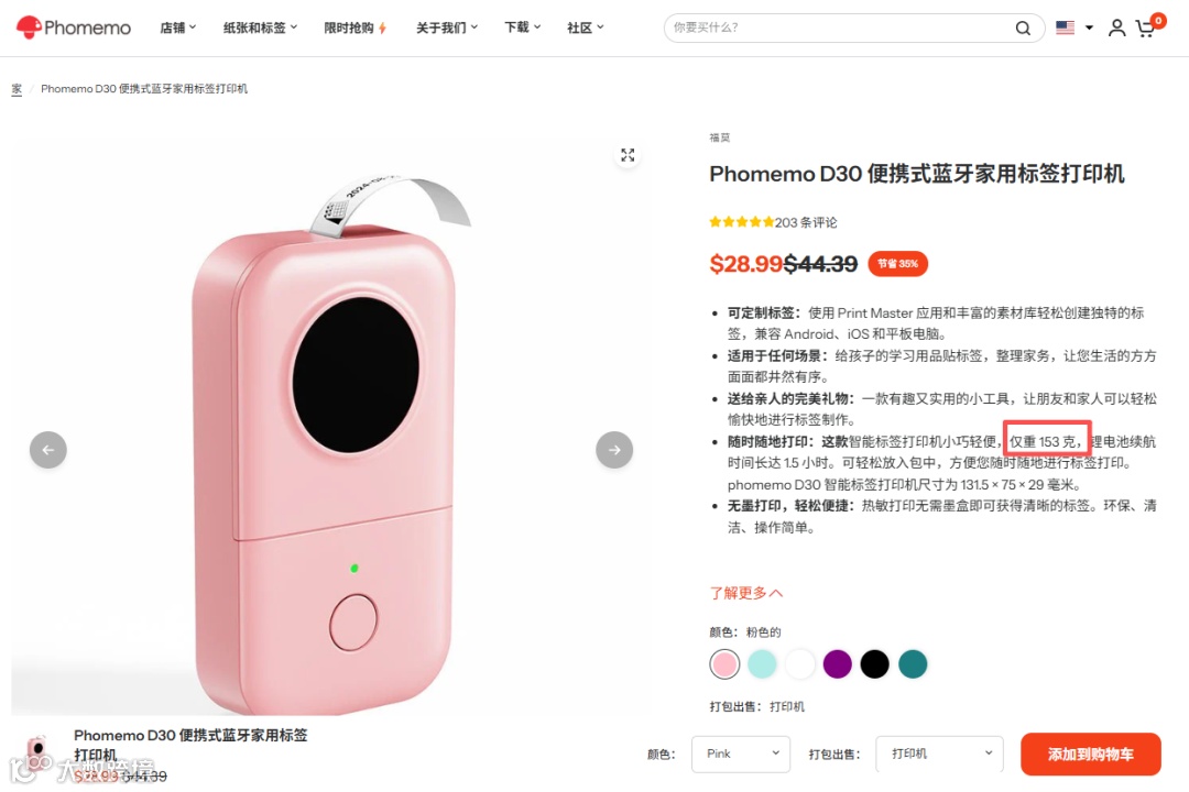 在面对惠普、佳能等国际巨头垄断的打印机市场,Phomemo选择了差异化破局路线。Phomemo聚焦热敏打印机市场,避开老牌企业主导的传统喷墨和激光打印赛道。通过轻量化设计,其系列便携式打印机产品重量仅在300克左右,D30迷你标签打印机仅有153克,比一瓶水还轻,方便用户随时随地打印。