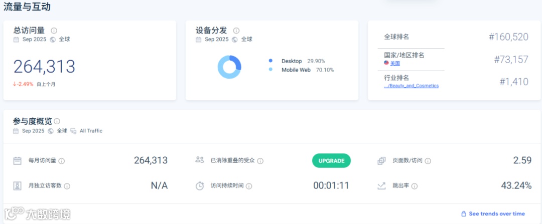 在验证产品可行性后,Phomemo迅速扩大渠道,一边入驻eBay、速卖通、沃尔玛等电商平台,一边搭建品牌独立站,沉淀私域用户。Similarweb数据显示,Phomemo独立站移动端流量占比超7成,月均26万+访问、人均浏览2.6页且停留1分11秒,跳出率仅43%,显示出精准受众与高粘性,具备持续转化潜力。
