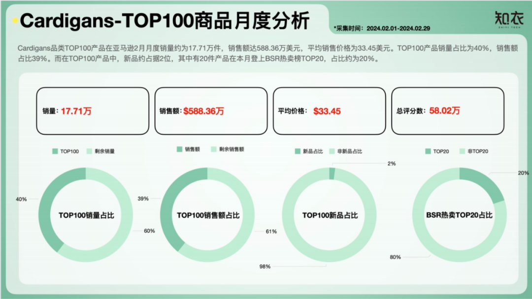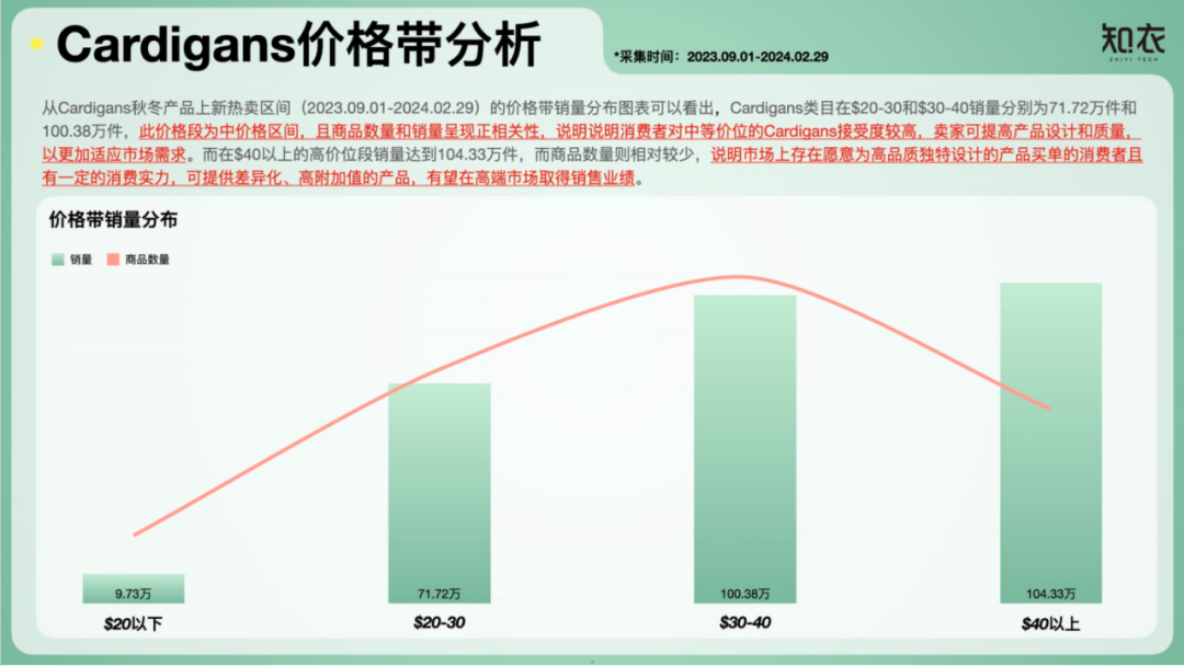 2023年9月至2024年2月期间,Cardigans在$30-40价格段销量超100万件,显示中高价位产品受到广泛认可,市场空间仍然可观。