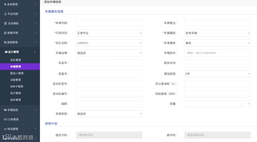 ① 前期配置,在系统内录入车辆、司机、常跑路线、货单分类规则等基础信息,设置空驶率、时效达标率等核心预警指标。