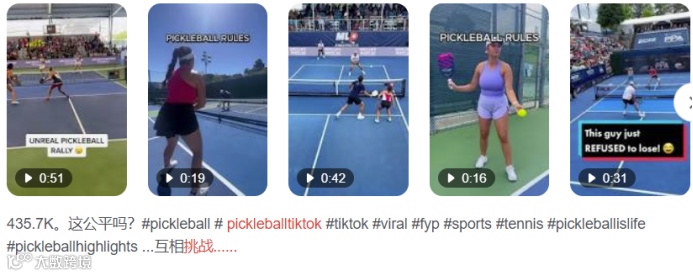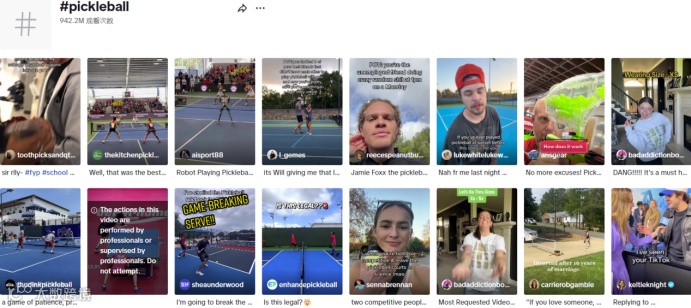 “#pickleball”话题在TikTok上拥有9.42亿次观看,许多匹克球爱好者在社交媒体上分享打球趣事以及匹克球套装推荐,匹克球相关视频热度都很高,通过社交媒体的宣传,匹克球运动正在受到越来越多人关注,需求量突增。