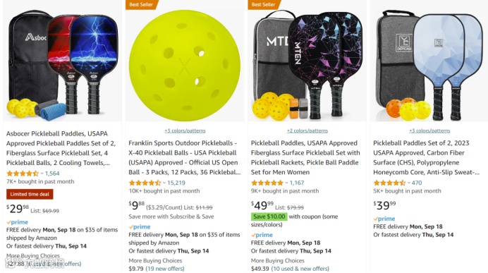 根据观察发现,在亚马逊上匹克球及套装销量较好的几款售价一般都在$9.88——$49.99,匹克球套装内包含球、球拍、球套、运动护腕等,在TOP100有多个新品销量都很高,匹克球市场潜藏巨大商机。