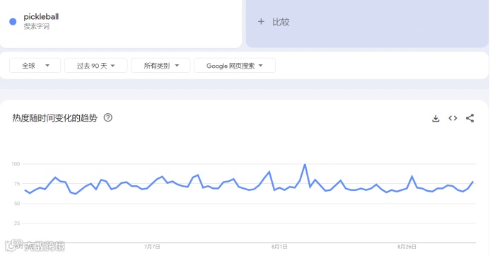 在谷歌趋势搜索“pickleball”,近90天内全球范围内搜索热度持续在70——100之间,“2023匹克球日”、“匹克球俱乐部”等相关词汇搜索热度飙升1350%、3450%。