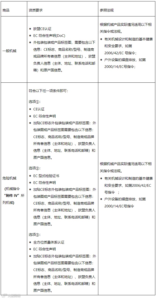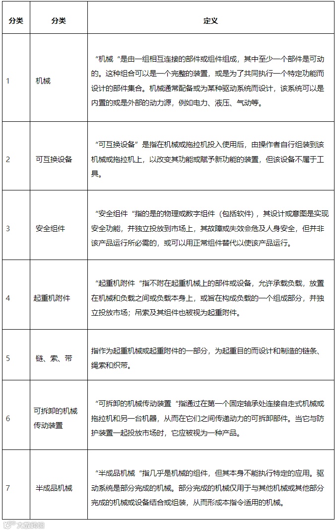 法规适用: 机械指令适用于以下商品:机械;可互换设备;安全组件;起重配件;链条、绳索和织带;可拆卸的机械传动装置;半成品机械。下文统称“机械商品”。