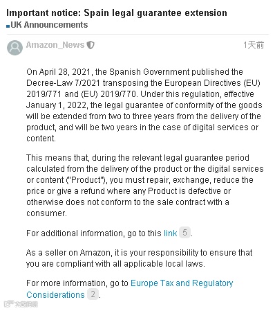 亚马逊欧洲站发布公告,西班牙政府新法令将产品保证期从两年延长至三年。