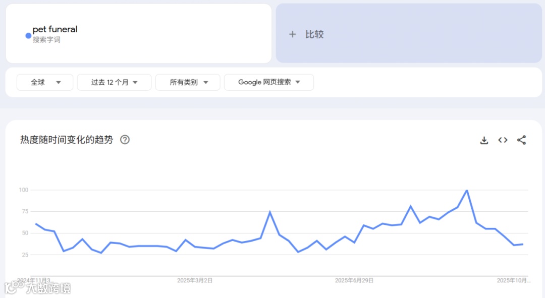 Google Trends搜索“pet funeral(宠物殡葬)”显示,搜索热度在27-100的区间范围内,“体面告别”正成为一种刚需。