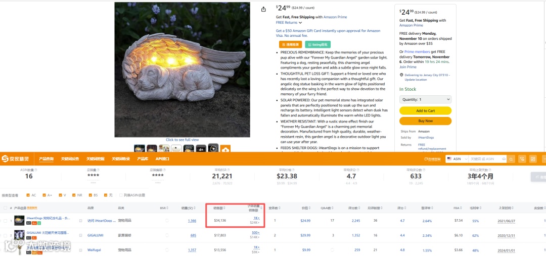 其中,一款会发光的宠物纪念石最受欢迎,近30天销量1000+,销售额达3.4万美元。