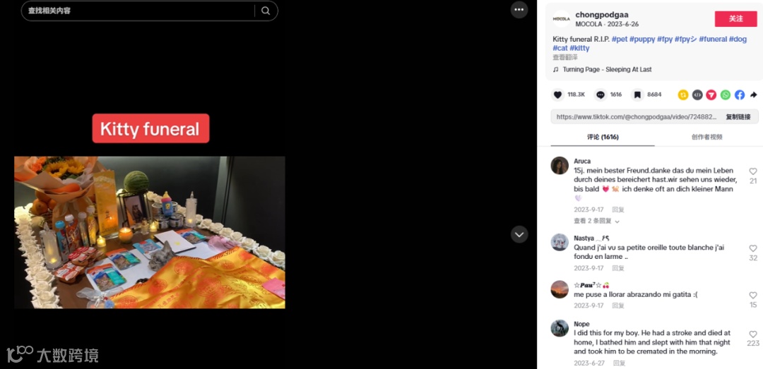 TikTok上,#petfuneral 标签下的视频数量超1000条,其中最高播放量的视频突破百万。