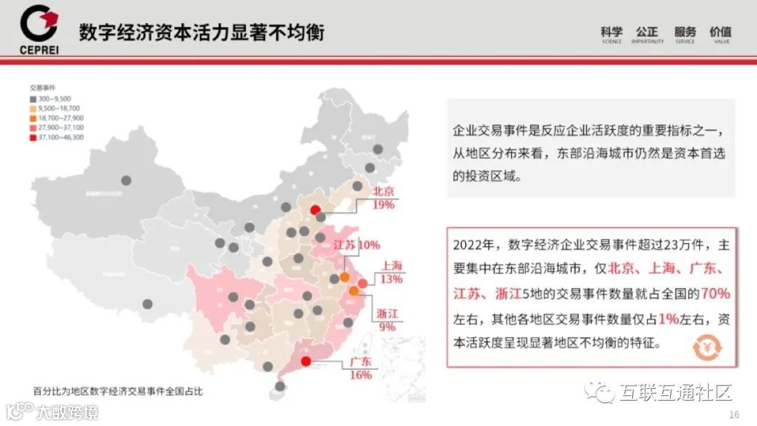资本活力方面,数字经济企业交易事件2022年超23万件,主要集中于东部沿海。北京、上海、广东、江苏、浙江五地交易量占全国约70%,凸显资本活跃度区域不均特征[k]。