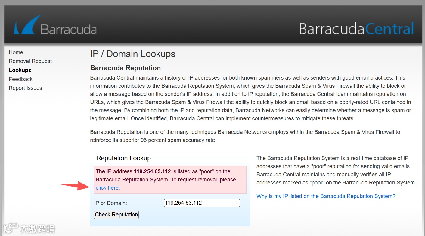 1,登录网址https://www.barracudacentral.org/lookups,输入您的IP,点击“check reputation”