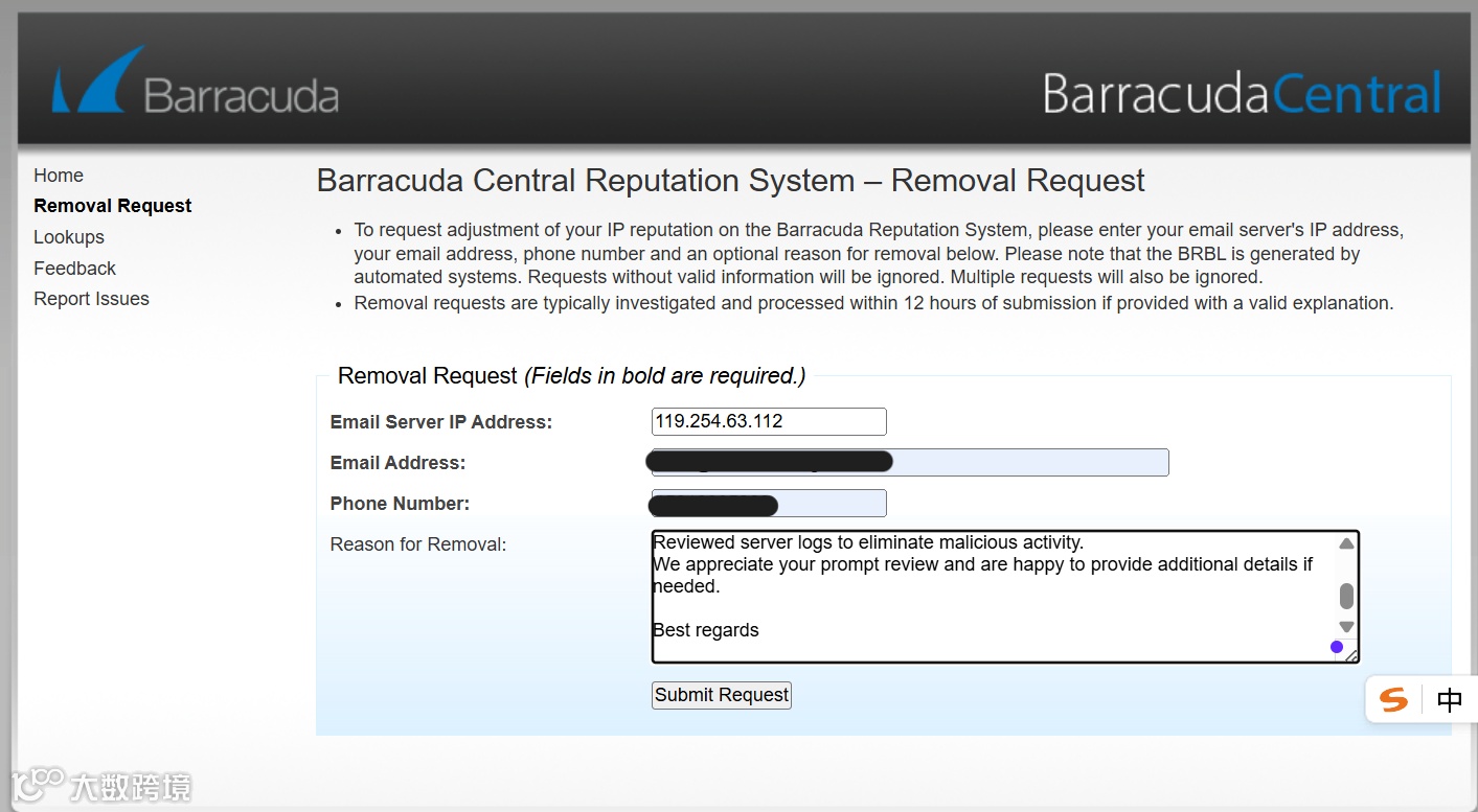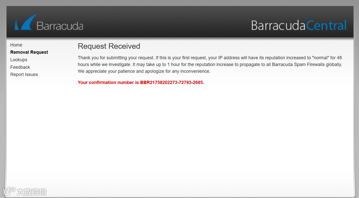 如果邮件群发时,发现退信显示IP被barracudacentral列入黑名单,可以登录其官网申请移除,步骤如下: