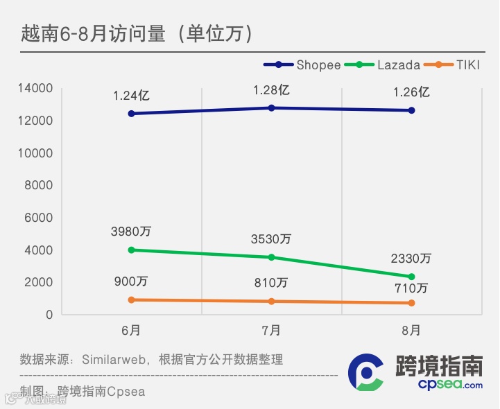 Lazada 8月访问量约为2330万,环比下降了33.95%.但是,Lazada 8月访问量环比降幅超过7月,7月环比下降了12.35%。TIKI 8月访问量约为710万,环比下降了12.35%。