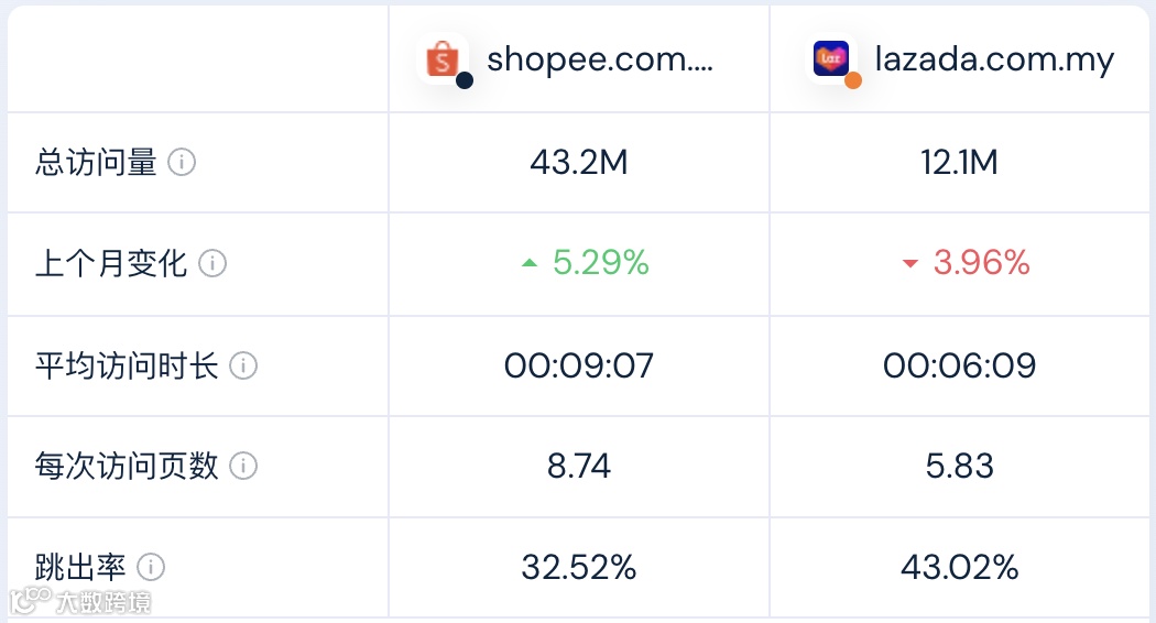 Shopee马来西亚的用户平均访问时长达到9分7秒,每次访问页数为8.74页,跳出率为32.52%。Lzazda平均访问时长为6分9秒,每次访问页数为5.83页,跳出率为43.02%。马来西亚Shopee的用户参与度和粘性均高于Lzazda。