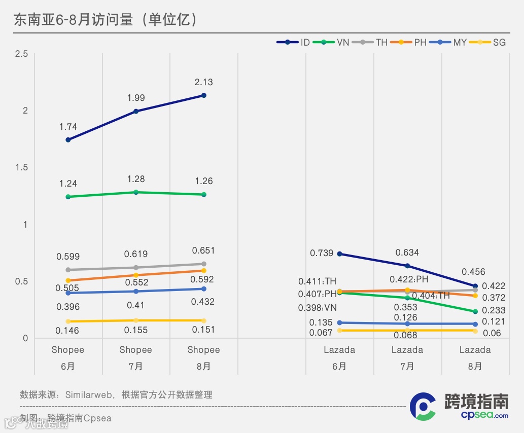根据Similarweb的数据,从东南亚6个电商市场(印度尼西亚、越南、泰国、菲律宾、马来西亚、新加坡)页面访问量(PV)变化趋势看,2023年8月,Shopee的访问量遥遥领先于Lazada。