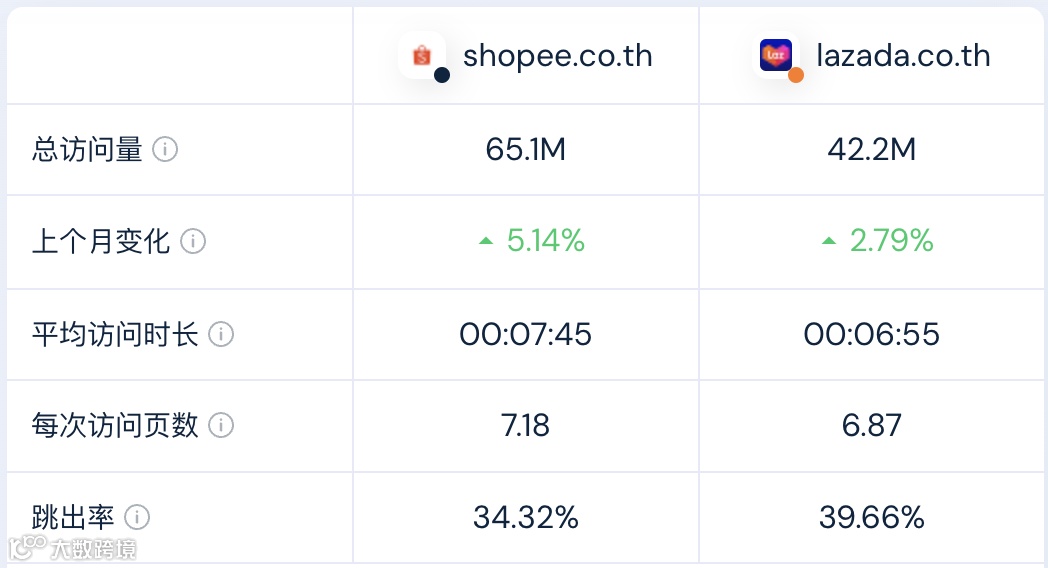 Shopee泰国用户平均访问时长为7分45秒,每次访问页数为7.18页,跳出率为34.32%。Lazada平均访问时长为6分55秒,每次访问页数为6.87页,跳出率为39.66%。