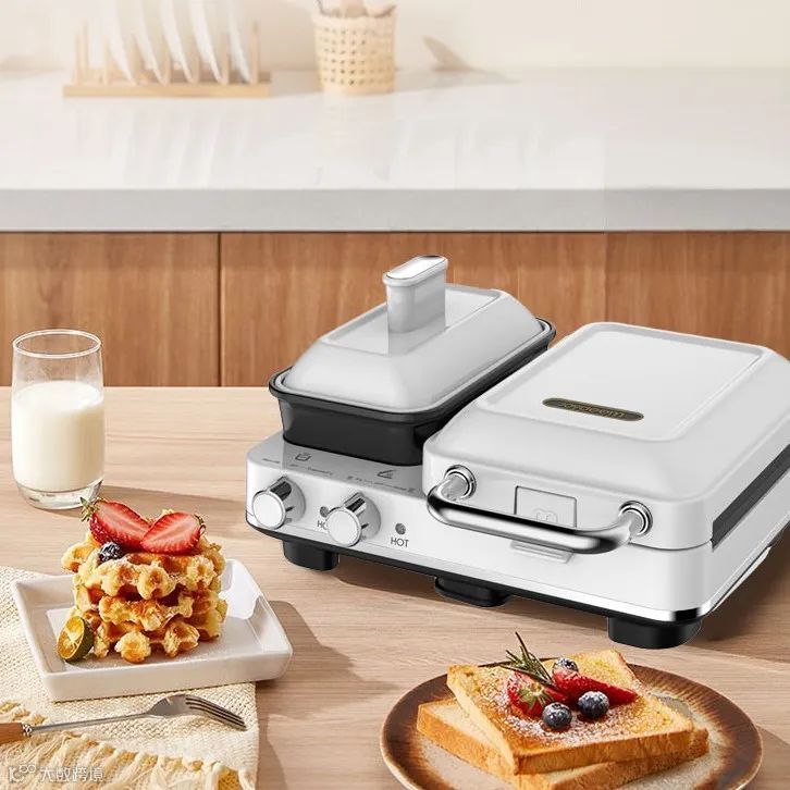 融合三明治机、煎锅、蒸锅、华夫饼机功能于一体,双旋钮分区控制,可同步操作。椰奶白配色搭配英伦风格,提升厨房颜值,轻松制作中西各式早餐[k]。