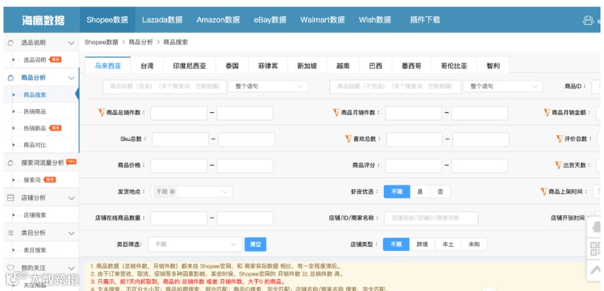 如下:从截图可以看出,这个工具具有亚马逊、Shopee、lazada、eBay、沃尔玛和Wish 这6个平台的选品功能。