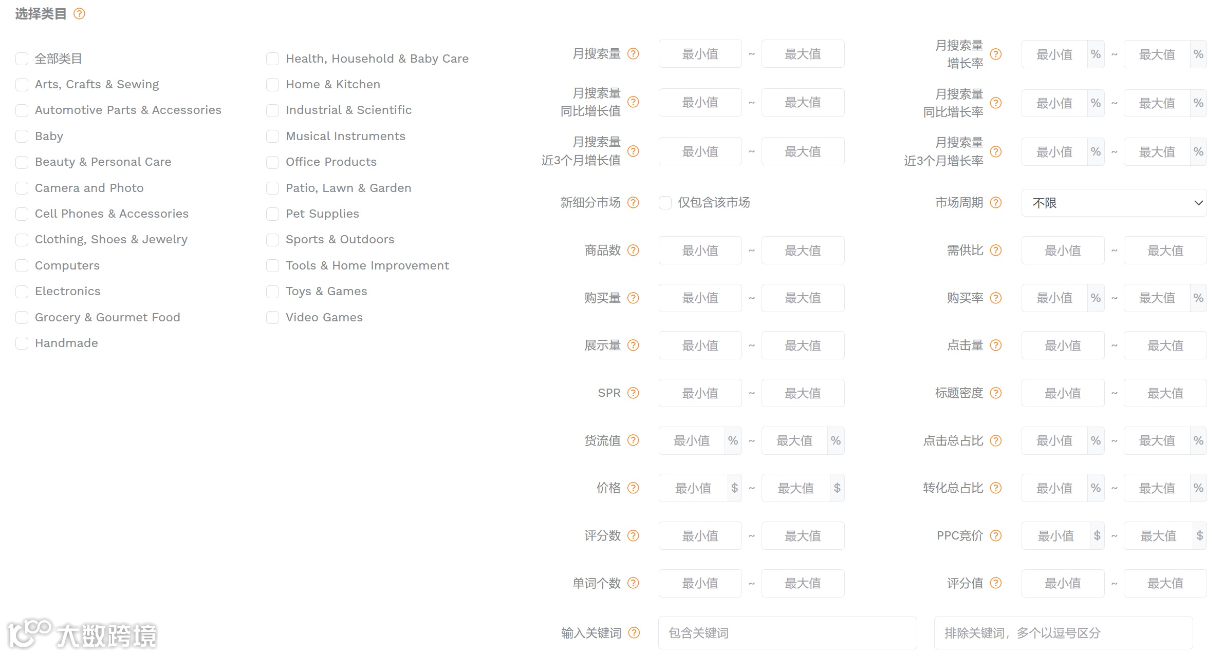 结合自身情况,在【关键词选品】中选择目标类目,设置好筛选条件进行搜索。条件越详细越好,重点设置: