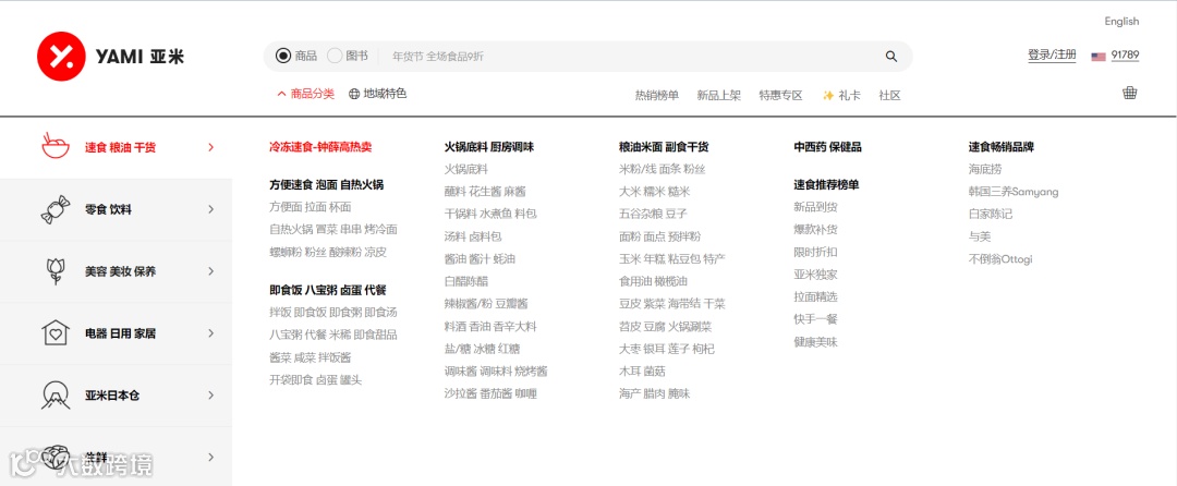 打开网站导航可以发现,亚米网的产品分类非常细致,仅方便速食产品就含有“方便面、拉面、杯面、自热火锅、冒菜、串串、烤冷面、螺蛳粉、粉丝、酸辣粉、凉皮”12个关键词,火锅底料和调料有28个关键词,几乎囊括了所有常见的口味。
