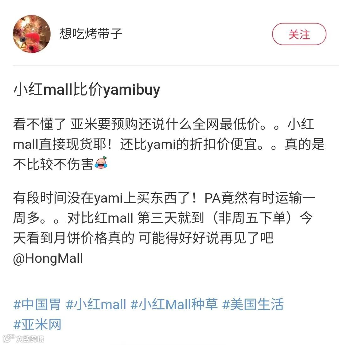 有用户将亚米网与小红mall进行晒单比较,称小红mall的东西更便宜,送达更快。