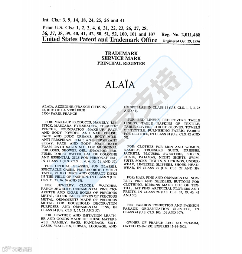 本案是SMG律所在佛罗里达州代理的一起全新奢侈品维权案,来自法国巴黎的Alaïa品牌,该商标于1996年10月29日在美国取得商标认证,注册在第18和25类,分别包括:皮具,即和雨伞类;女装,即鞋服、泳衣、内衣、头饰等。跨境卖家注意甄别,速速排查下架。