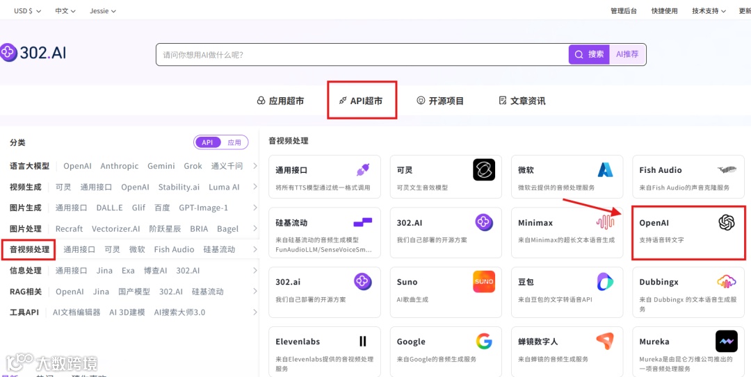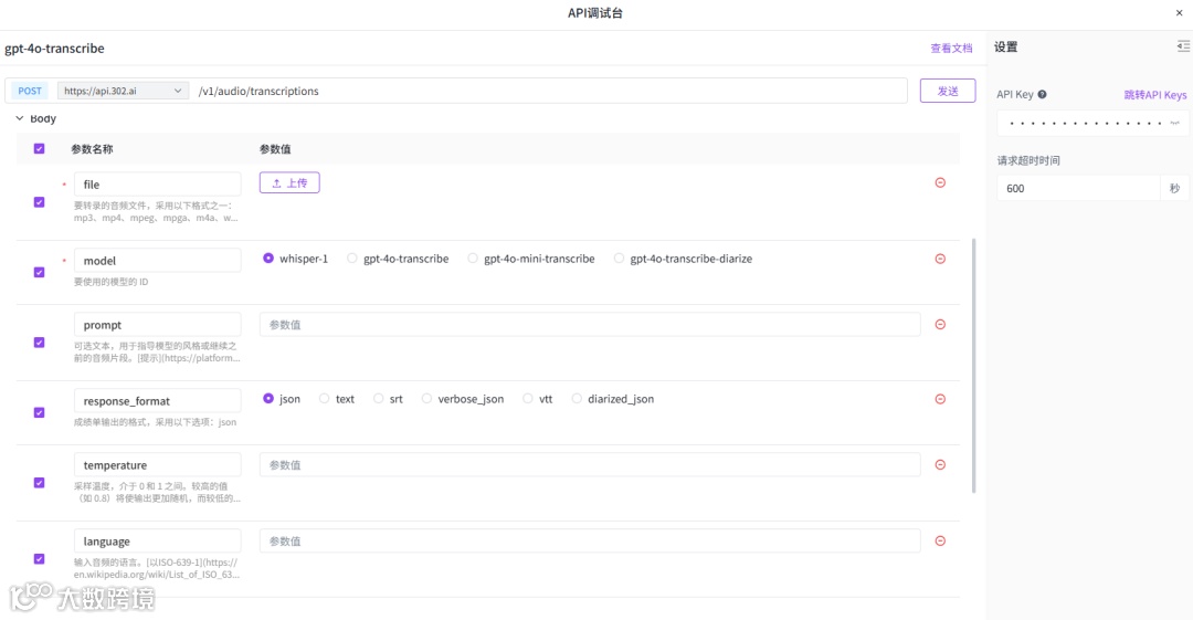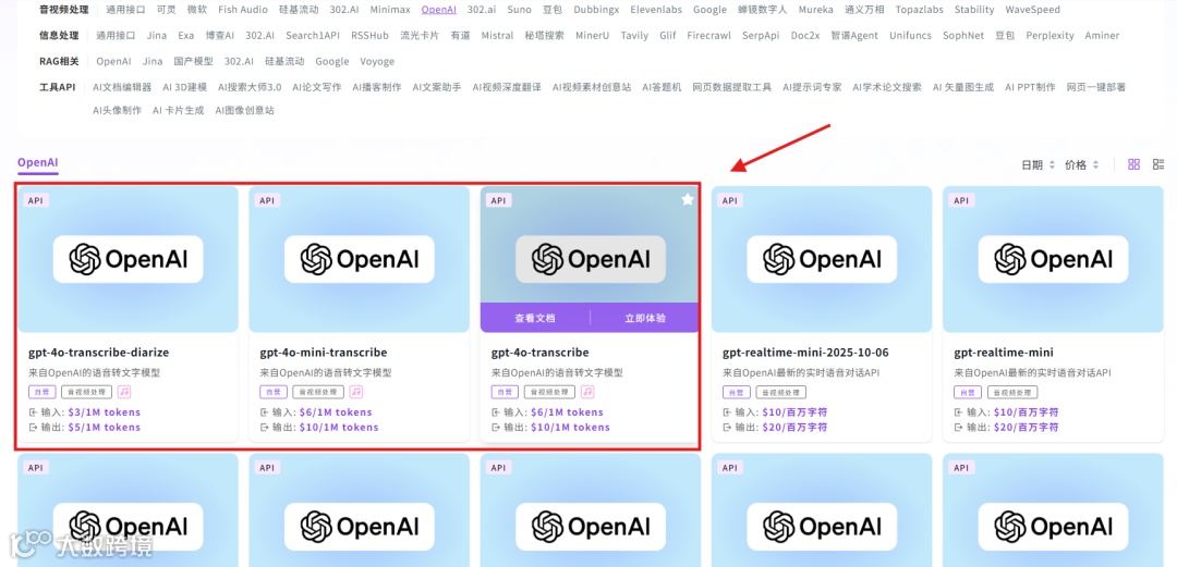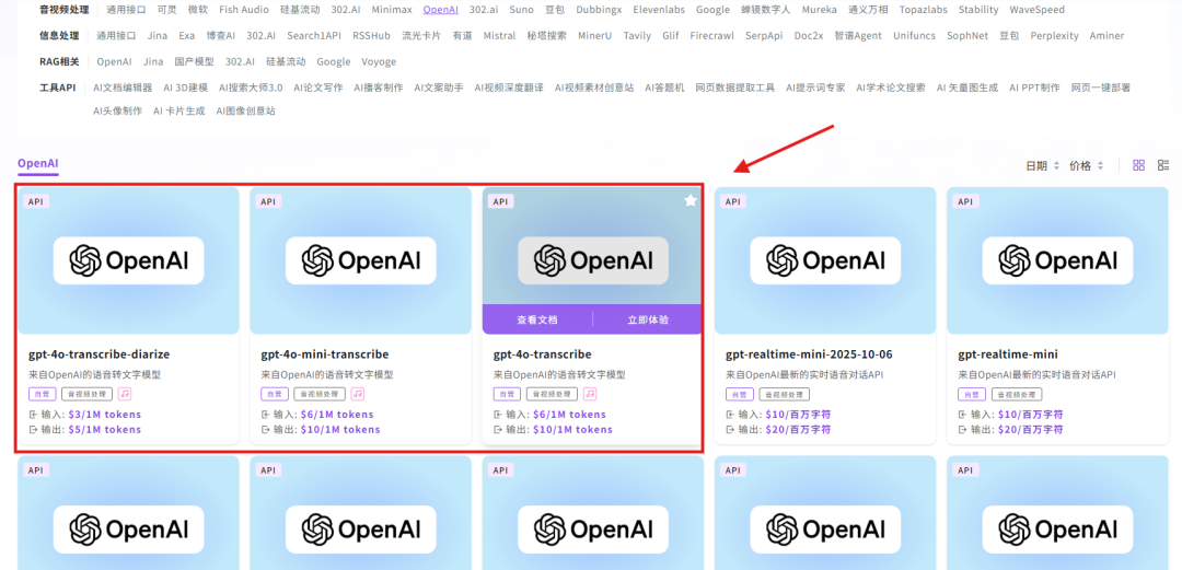 步骤指引:API超市→音视频处理→OpenAI→gpt-4o-transcribe