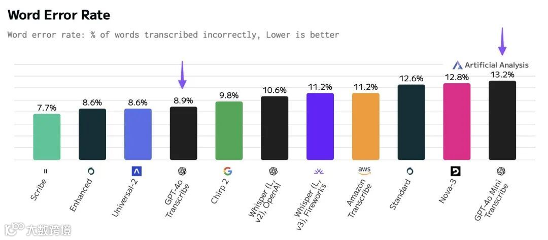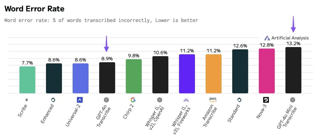 gpt-4o-transcribe 被官方定位为原有 Whisper 模型的升级版本,在词语错误率、语言识别和准确性方面较 Whisper 都有很大提升,并增强了对噪音环境和多语言的处理能力。