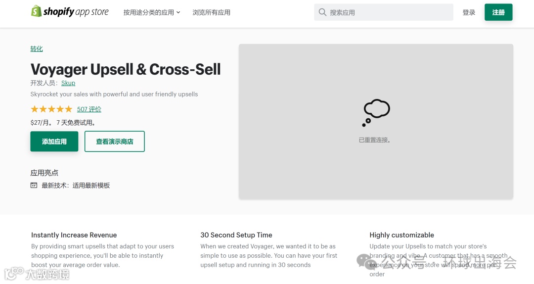 17. Voyager Upsell & Cross-Sell:支持结账页面追加销售、捆绑推荐与加价购策略,提升客单价[k]。提供7天试用,订阅价$27/月[k]。