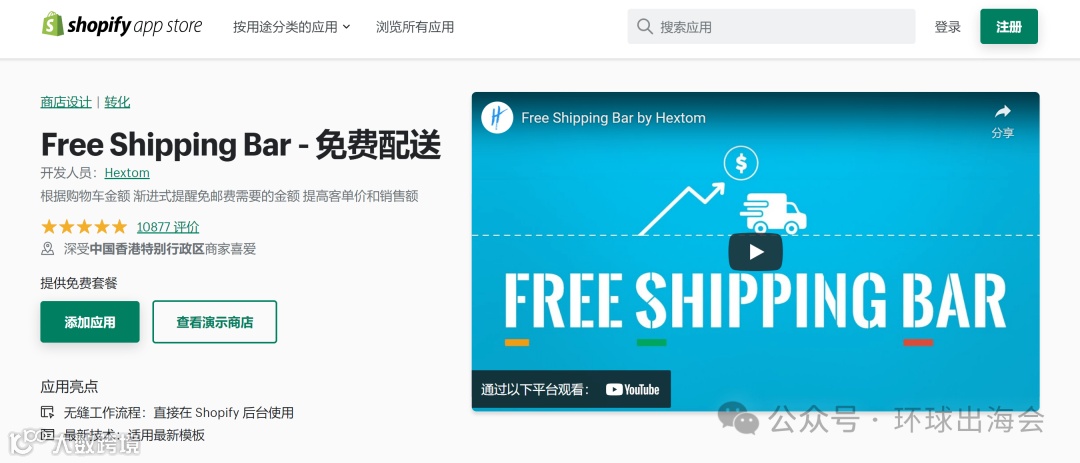 23. Hextom Free Shipping Bar:顶部横幅展示免运费进度条,激励用户凑单[k]。数据显示88%消费者倾向选择包邮店铺,免运费订单金额平均高出30%[k]。插件免费使用[k]。