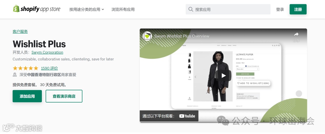 Wishlist Plus支持与Shopify商店集成,帮助客户轻松收藏心仪商品并可选择分享,提升购买转化率。该插件提供30天免费试用,免费计划支持最多100件商品收藏,付费套餐价格区间为$14.99至$99.99/月[k]。