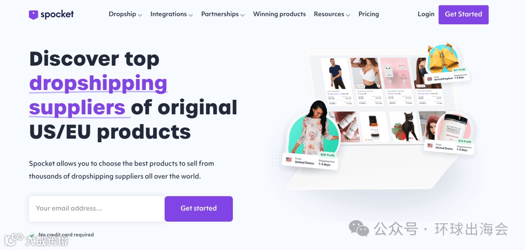 3. Spocket:专注美国与欧洲优质供应商资源,提供快速配送、品牌发票及手工独特商品,支持实时库存更新与自动订单同步[k]。基础版免费上传25个产品,专业版$99/月不限数量[k]。